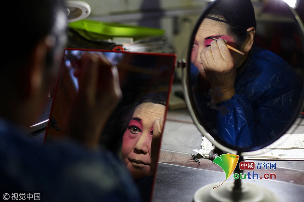 2016年3月10日,陜西安康,今年70歲的劉鳳鳴10歲時(shí)開始學(xué)漢調(diào)二黃,40歲時(shí)從廁所抱回智殘?bào)w殘棄嬰,因?yàn)閷?duì)藝術(shù)的熱愛、對(duì)生命的敬畏她選擇了不離不棄。人生如戲,戲如人生。劉鳳鳴說,像她們這樣的業(yè)余劇團(tuán),沒有專門的化妝師,她要求每個(gè)演員必須學(xué)會(huì)化妝。圖片作者:魏永賢/視覺中國