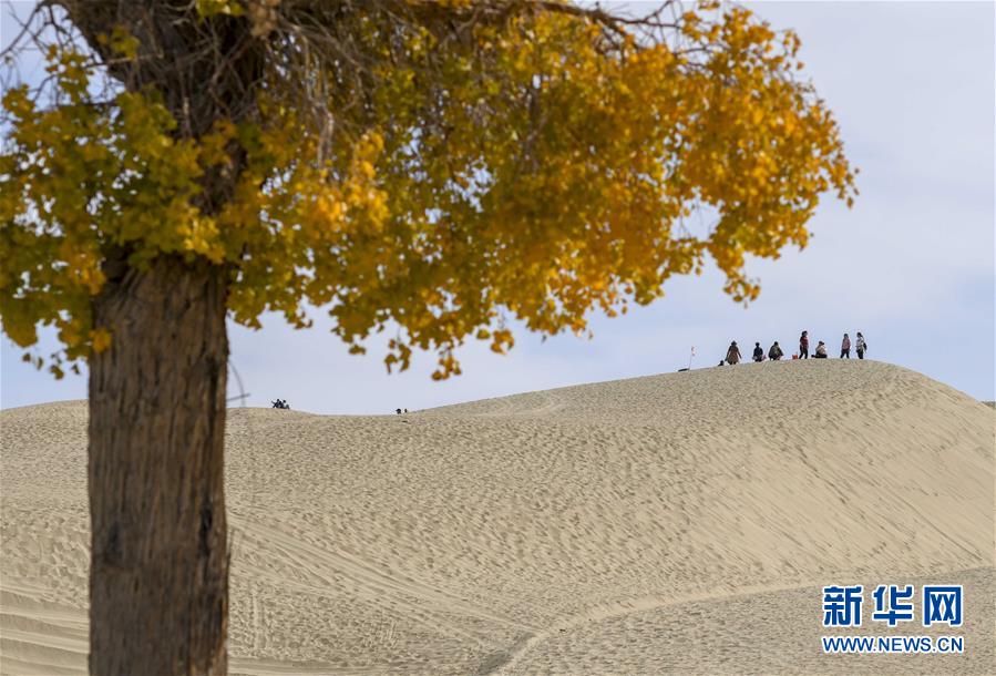 10月16日,在羅布人村寨,游客在沙脊上欣賞美景。新華社記者 趙戈 攝