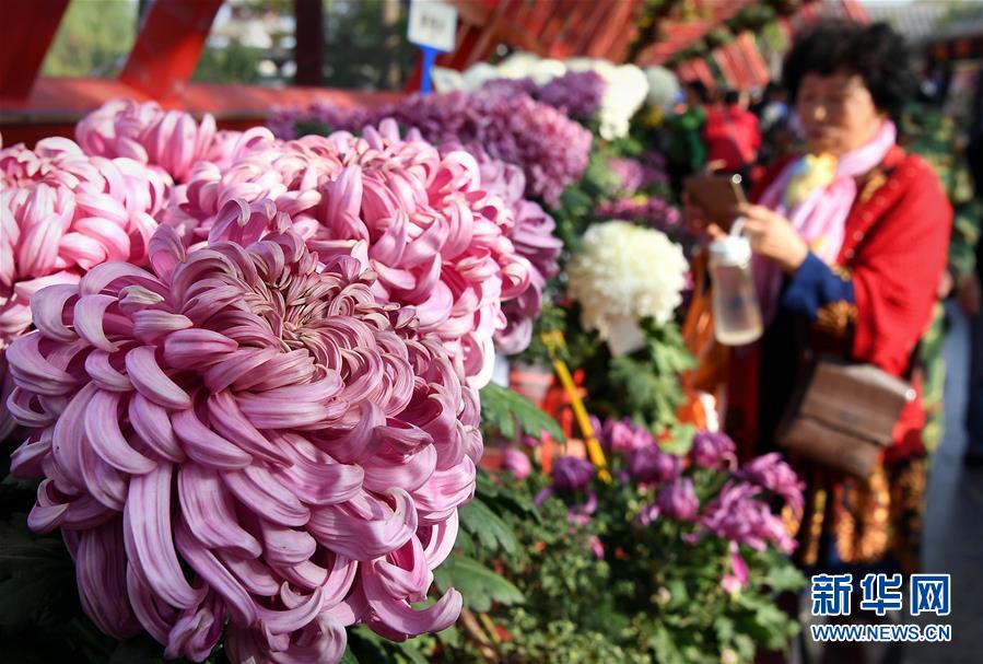 10月17日,游客在開封清明上河園內(nèi)拍攝展出的菊花。重陽時節(jié),各色菊花競相綻放,把古都開封裝點得分外秀美,吸引眾多游客前來觀賞游玩。 新華社記者 李安 攝
