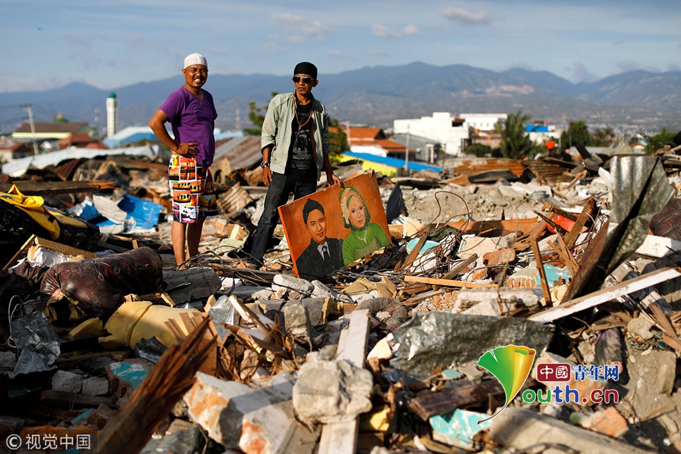 當(dāng)?shù)貢r(shí)間2018年10月7日,印尼帕盧,兩名男子從地震廢墟中找回他們?nèi)ナ栏改傅漠嬒瘛D片作者:JORGE SILVA/視覺中國