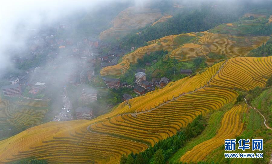 這是10月16日無(wú)人機(jī)拍攝的龍脊梯田秋色。金秋時(shí)節(jié),廣西龍勝各族自治縣龍脊梯田美如畫(huà)卷。 新華社記者 黃孝邦 攝