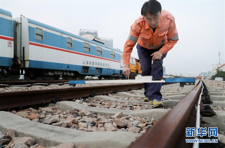 10月17日,李峰在上海何家灣站內(nèi)鐵軌上演示早期使用鋁合金道尺檢測(cè)鋼軌間距的操作。這一操作全憑檢修工人經(jīng)驗(yàn),近四公里的線路檢查,需要工人彎腰上千次。 新華社記者 方喆 攝
