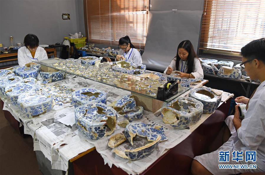 在江西景德鎮(zhèn),工作人員修復明代瓷枕(9月20日攝)。 新華社記者 萬象 攝