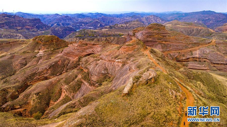 在黃土高原的陜西省延安市安塞區(qū)坪橋鎮(zhèn)王家灣,有一處峽谷丹霞地貌,是2017年陜西省地質調查院在陜北及渭北地區(qū)發(fā)現(xiàn)大規(guī)模丹霞地貌的一部分。這里的山勢頂部被黃土覆蓋,底部經(jīng)流水下切侵蝕紅色砂巖外露,出露的巖石紋理如波浪,深秋中猶如一幅流動的畫卷。