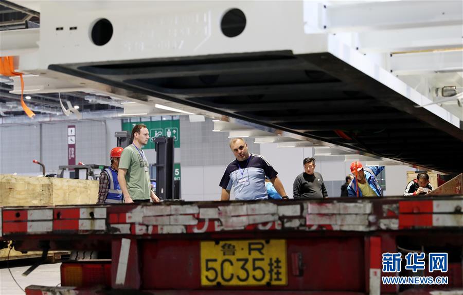 10月22日,德國(guó)工程師馬丁·霍爾茨海德(中)在吊裝過(guò)程中查看“金牛座”龍門(mén)銑床床身位置。 當(dāng)日,來(lái)自德國(guó)的首屆進(jìn)口博覽會(huì)最大展品——“金牛座”龍門(mén)銑床完成初步組裝,將運(yùn)往國(guó)家會(huì)展中心(上海)3號(hào)館進(jìn)行最后的安裝施工。這是德國(guó)瓦德里??票す狙邪l(fā)的機(jī)床設(shè)備,高約8米,占地面積約200平方米,將在智能及高端裝備區(qū)進(jìn)行展出。 新華社記者方喆攝
