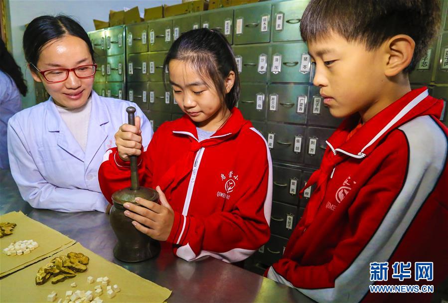 10月22日,安平縣啟蒙小學(xué)學(xué)生在安平縣中醫(yī)院醫(yī)生的指導(dǎo)下體驗(yàn)用傳統(tǒng)工具加工中草藥。 當(dāng)日是世界傳統(tǒng)醫(yī)藥日,河北省安平縣啟蒙小學(xué)組織學(xué)生走進(jìn)安平縣中醫(yī)院,通過參觀中藥房、認(rèn)識(shí)常見中藥、感受中藥加工等方式,向小學(xué)生普及中醫(yī)藥知識(shí),弘揚(yáng)傳統(tǒng)中醫(yī)藥文化。 新華社記者李曉果攝