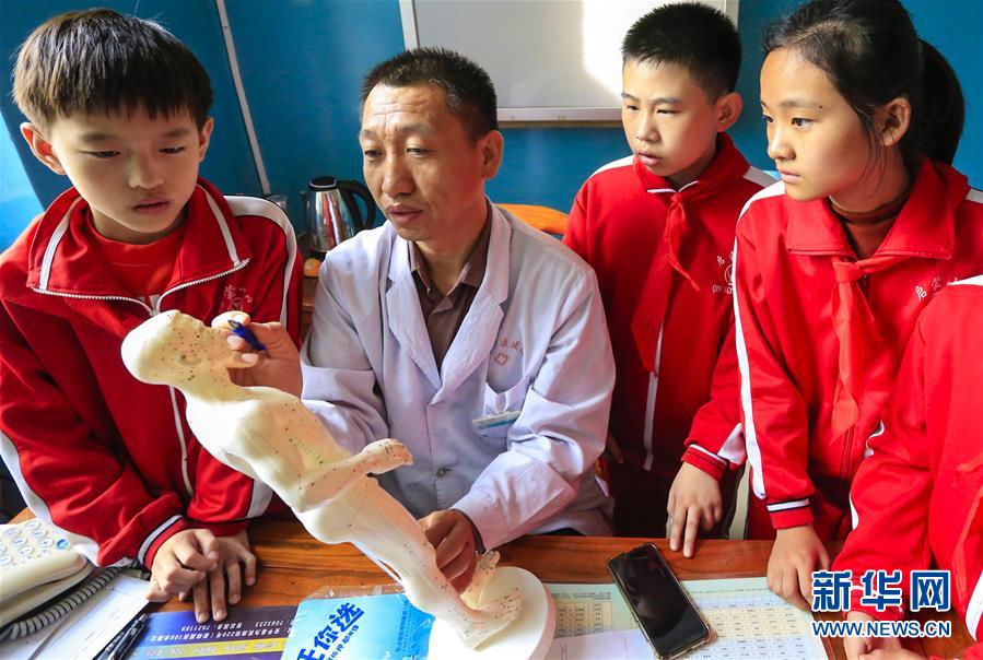 10月22日,安平縣中醫(yī)院醫(yī)生在教小學生認識人體穴位。 當日是世界傳統(tǒng)醫(yī)藥日,河北省安平縣啟蒙小學組織學生走進安平縣中醫(yī)院,通過參觀中藥房、認識常見中藥、感受中藥加工等方式,向小學生普及中醫(yī)藥知識,弘揚傳統(tǒng)中醫(yī)藥文化。 新華社記者李曉果攝