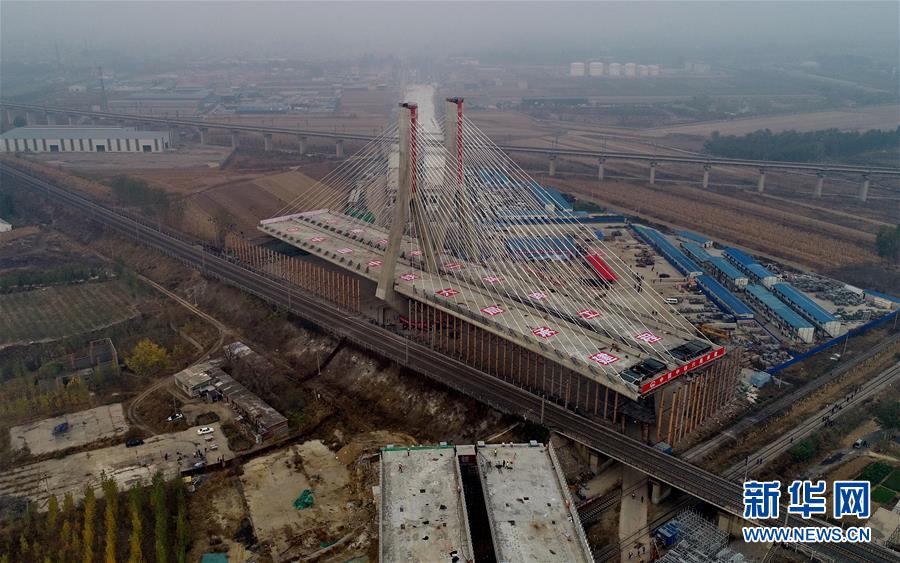 10月25日,唐山市二環(huán)路項目上跨津山鐵路斜拉橋在轉(zhuǎn)體中(無人機拍攝)。 當(dāng)日,河北省唐山市二環(huán)路項目上跨津山鐵路斜拉橋轉(zhuǎn)體成功。據(jù)介紹,該橋總長927.5米,主橋由斜拉轉(zhuǎn)體橋和轉(zhuǎn)體T構(gòu)橋組成,轉(zhuǎn)體總重5.1萬噸,其中斜拉轉(zhuǎn)體橋重3.3萬噸,主塔高達80.5米,為曲線變截面“雙人字”形空心塔,自上而下共有128根斜拉索。 新華社記者楊世堯攝