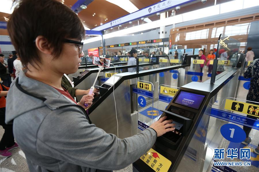 10月24日,一名男子手持自拍桿在自助通道過關。 當日,港珠澳大橋正式通車。