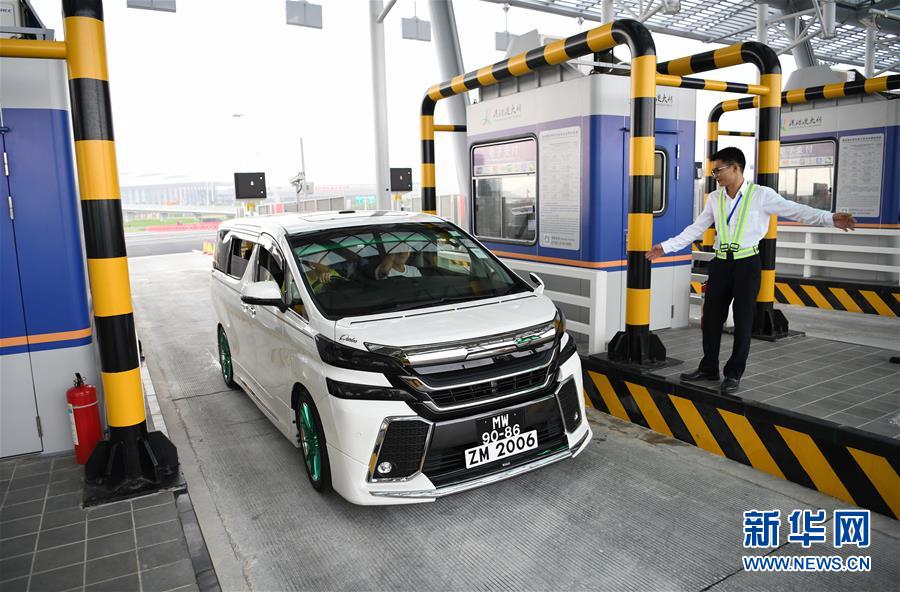 10月24日,首輛私家車在澳門口岸離境車道上通關。當日9時,港珠澳大橋正式通車。 新華社記者張金加攝