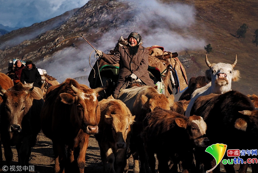 新疆阿勒泰天氣轉(zhuǎn)冷 牧民收拾行囊準備遷徙