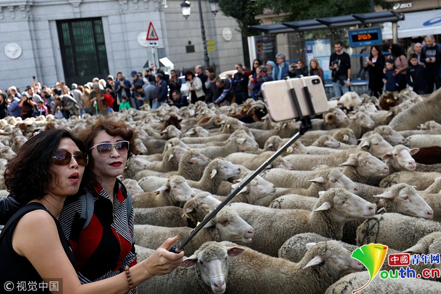 西班牙牧羊人驅(qū)趕羊群穿越馬德里 羊群進城“參觀”