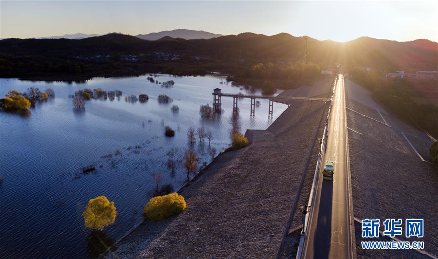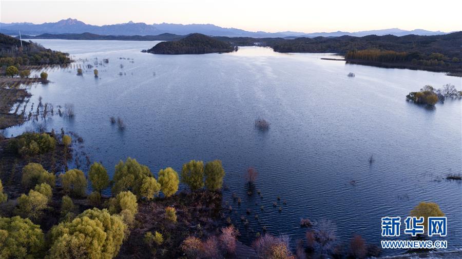 陽光照在北京密云水庫旁的山野上(10月30日無人機拍攝)。