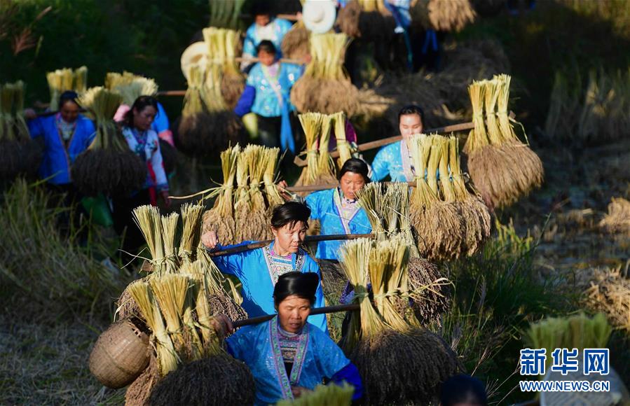 10月30日,在廣西融水苗族自治縣安太鄉(xiāng)元寶村,村民在收獲香糯。 新華社記者 吳建路 攝