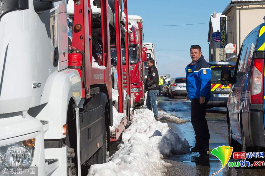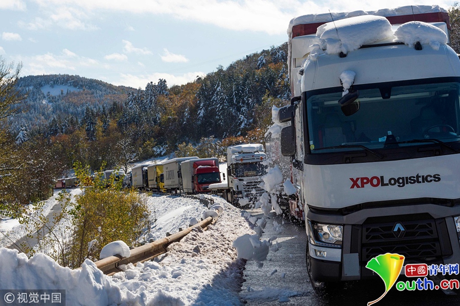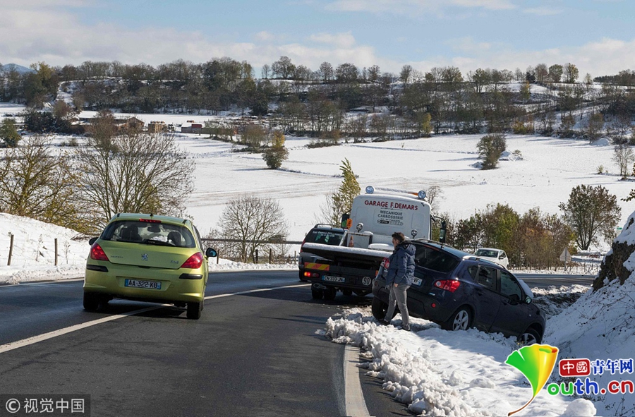 當(dāng)?shù)貢r間2018年10月30日,法國菲克斯圣熱內(nèi),當(dāng)?shù)赝唤荡笱?,?dǎo)致950人被困在大雪覆蓋的公路上,不得不睡在緊急救援中心。法國國家氣象局已經(jīng)將當(dāng)?shù)刂糜诔壬踩渲隆?/p>