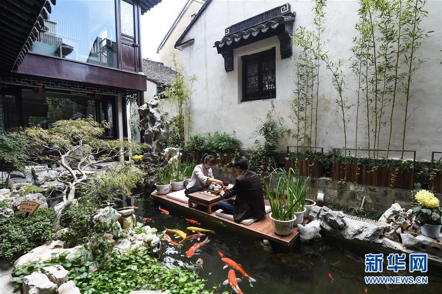 10月31日,在蘇州市吳江區(qū)同里古鎮(zhèn)的一處民宿,游客在喝茶休閑。 新華社記者李博攝