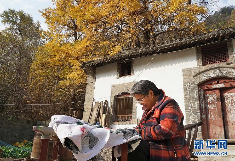 11月1日,河南省嵩縣白河鄉(xiāng)下寺村的一位村民在自家門(mén)前制作刺繡工藝品。 深秋時(shí)節(jié),河南省嵩縣白河鄉(xiāng)下寺村的古銀杏林為小山村披上了“金甲”。漫天黃葉,遍地金色,一幢幢民居掩映在色彩斑斕的世界里,美不勝收,吸引了眾多游客賞景拍照。 新華社記者 李安 攝