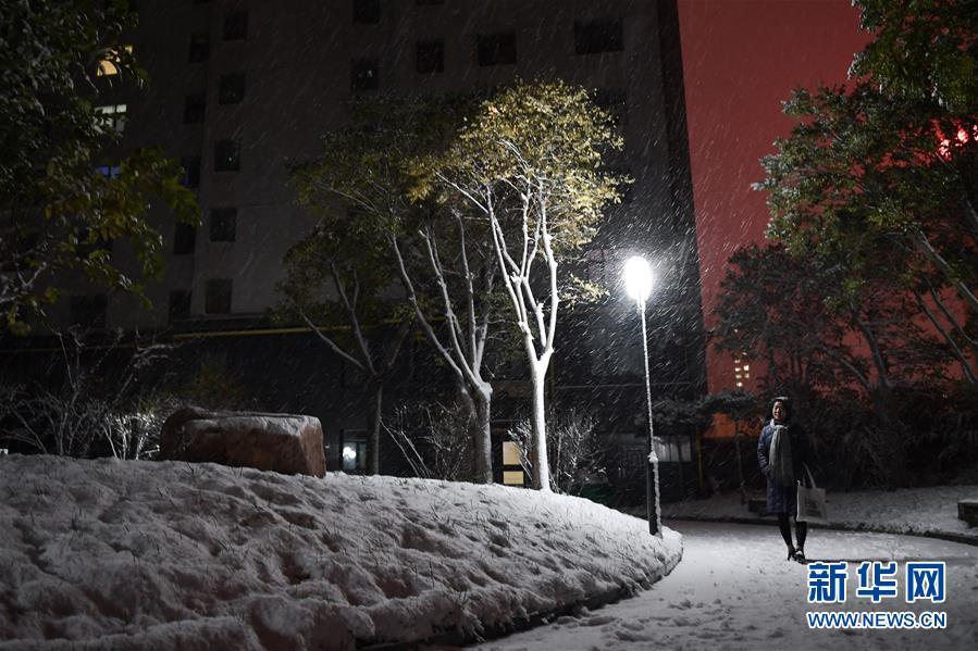 在青海省西寧市一小區(qū)內(nèi),一名市民在院內(nèi)前行(11月3日攝)。 11月3日,青海省西寧市等地迎來(lái)降雪。 新華社記者 吳剛 攝
