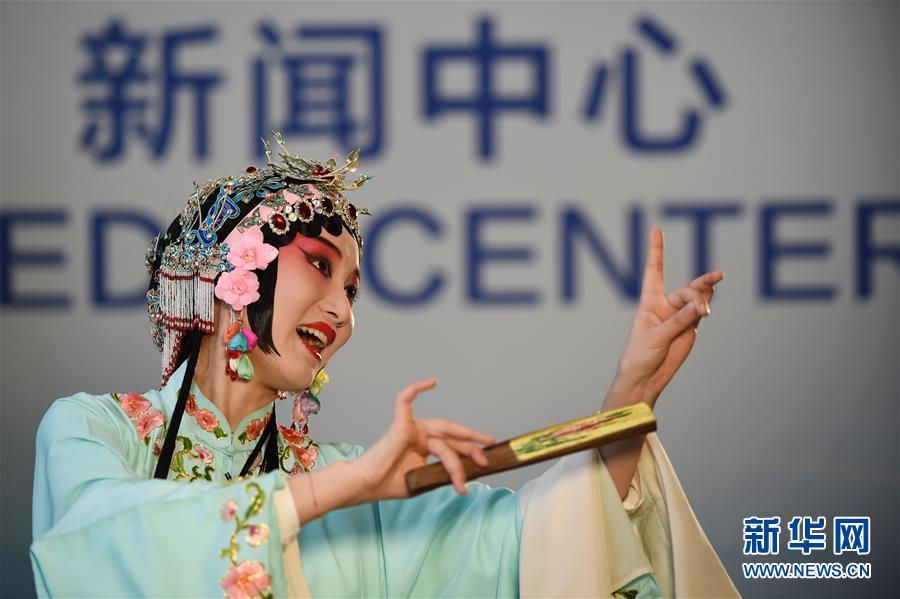 11月4日,在首屆中國國際進(jìn)口博覽會新聞中心,演員展示昆曲藝術(shù)。新華社記者 韓瑜慶 攝