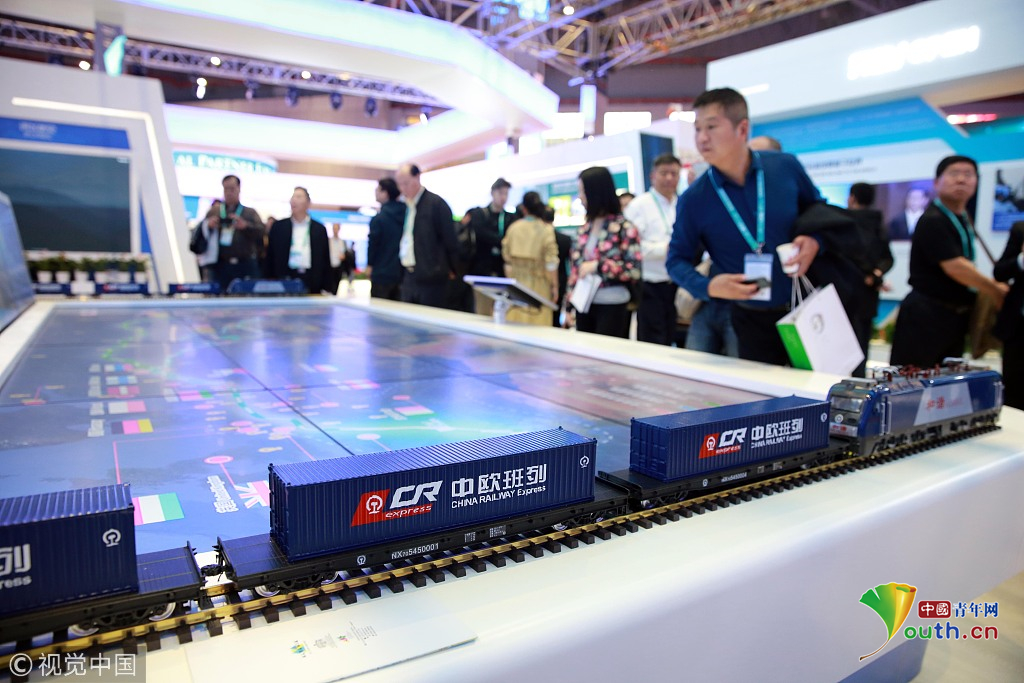 2018年11月6日,上海,首屆中國國際進口博覽會國家展上,共有82個國家、3個國際組織設立了71個展臺。中國館展示的中歐班列。視覺中國