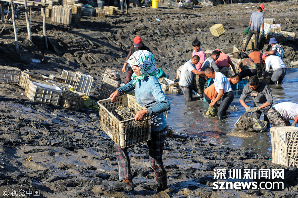 深圳新聞網(wǎng)訊 2018年9月8日,遼寧丹東,早上5點(diǎn),挖蟶人紛紛下到各個(gè)池子,要在海水海泥里艱辛勞作10小時(shí),直至下午3點(diǎn)集體上岸,等待買家的運(yùn)輸車隊(duì)運(yùn)走他們的勞動(dòng)成果。9月初,遼寧沿海養(yǎng)殖區(qū)進(jìn)入養(yǎng)殖海鮮的收獲季。在東港,常常出現(xiàn)數(shù)百人乃至上千人集結(jié)在池子里挖蟶子(這里特指縊蟶,即東港當(dāng)?shù)厝怂f的小人仙。下同)的壯觀景象。在養(yǎng)殖海鮮的收獲季,成群的海鷗趁機(jī)“助陣“,人與大自然和諧共處的畫面令人嘆為觀止。