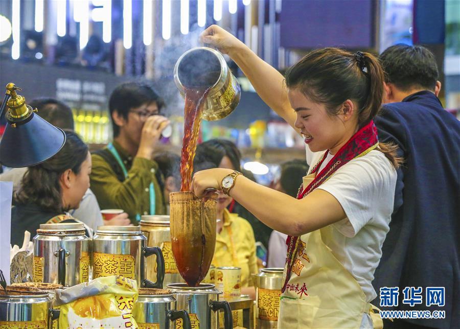 11月7日,在進(jìn)博會(huì)食品及農(nóng)產(chǎn)品展區(qū),參展人員制作“金茶王”港式奶茶。 新華社記者 殷剛 攝