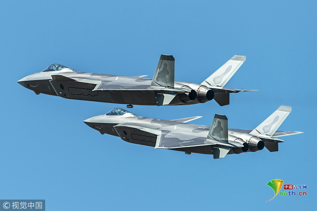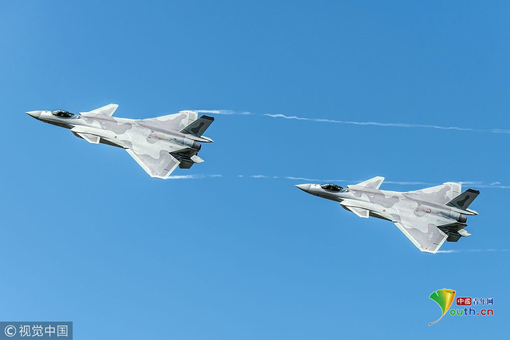 圖二:2018年11月6日,廣東珠海航展上,兩架殲-20戰(zhàn)機(jī)組成雙機(jī)編隊(duì)進(jìn)行飛行表演。