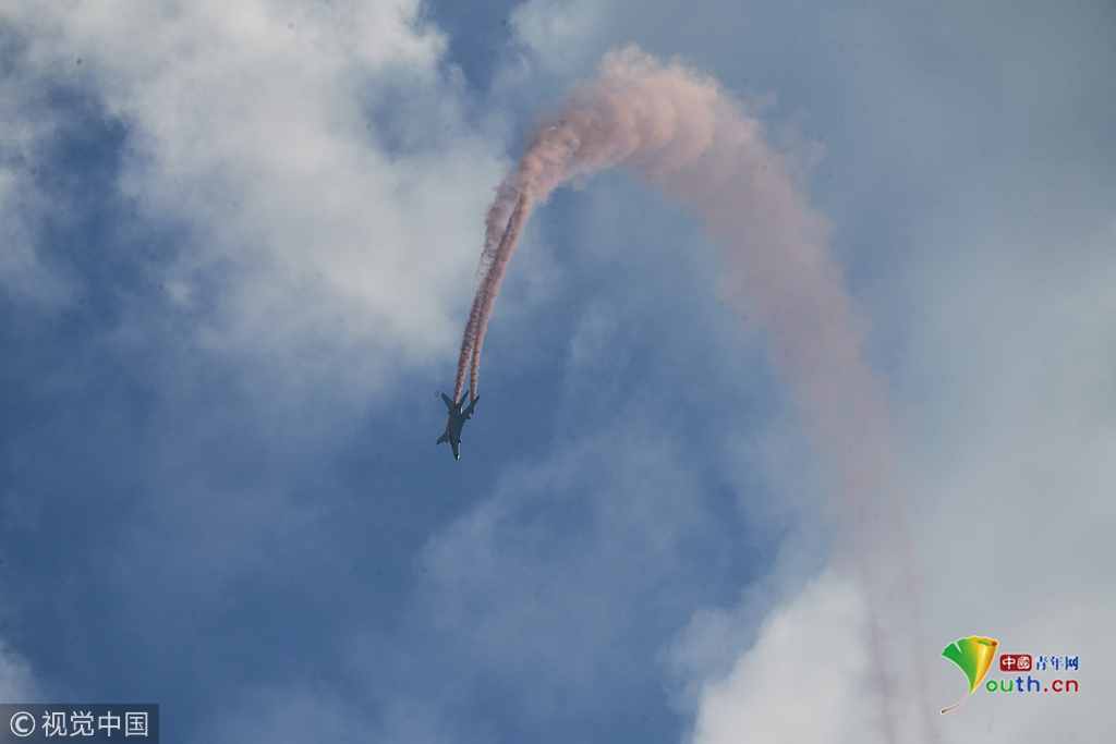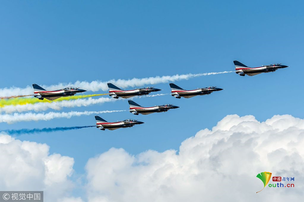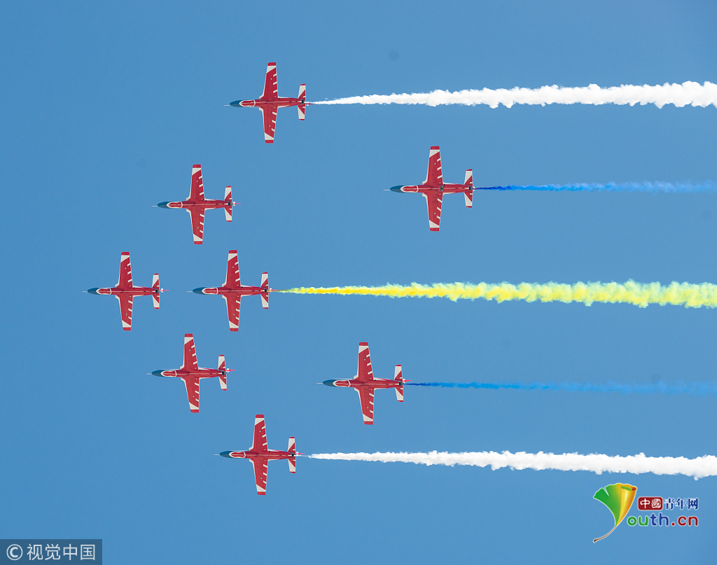 2018年11月8日,廣東珠海,第十二屆中國(guó)國(guó)際航展第三天??哲姟鞍艘弧憋w行表演隊(duì)的隊(duì)員們,發(fā)揚(yáng)連續(xù)作戰(zhàn)精神,給觀眾們表演了七機(jī)分組開(kāi)花、四機(jī)編隊(duì)橫滾等高難動(dòng)作,受到觀眾們的稱贊。視覺(jué)中國(guó)