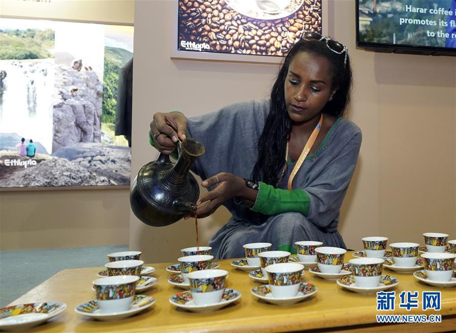 11月6日,在首屆中國(guó)國(guó)際進(jìn)口博覽會(huì)上,埃塞俄比亞參展人員為參觀者倒咖啡。新華社記者 沈伯韓 攝