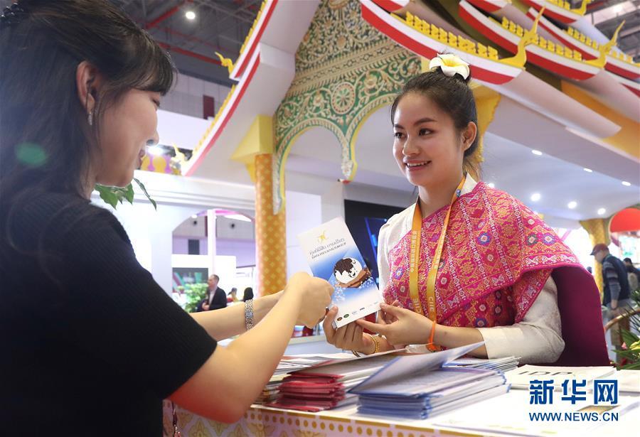 11月7日,在首屆中國(guó)國(guó)際進(jìn)口博覽會(huì)上,老撾展區(qū)工作人員(右)在向參觀者介紹情況。新華社記者 陳飛 攝