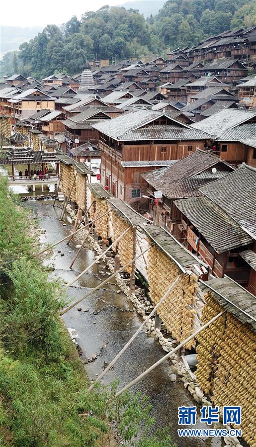 貴州省黔東南苗族侗族自治州從江縣高增鄉(xiāng)占里村晾滿稻谷的禾晾架與侗寨房屋相映成景(10月17日無人機拍攝)。 金秋時節(jié),農(nóng)民們忙著收獲成熟的農(nóng)作物,喜迎豐收。 新華社記者陳曄華攝