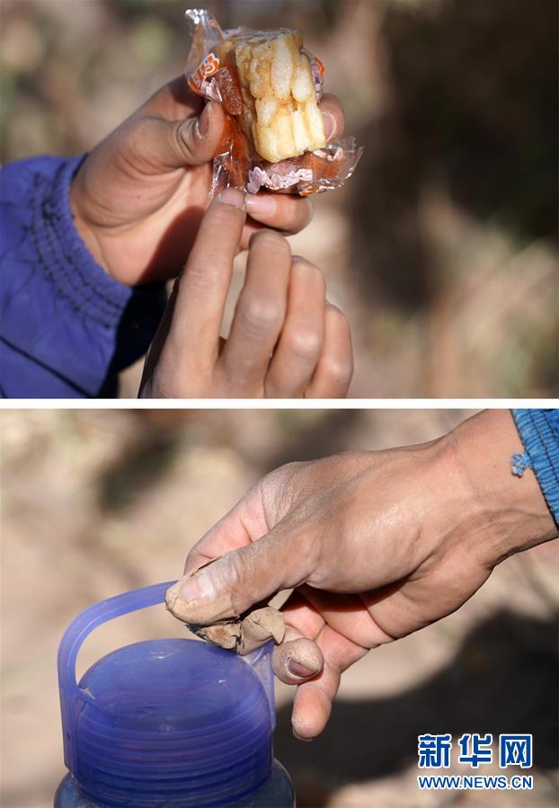 拼版照片:上圖為陳喜波的妻子王登興在棉田里用簡單的食品作午餐;下圖為陳喜波在午餐時準備喝水(10月23日攝)。
