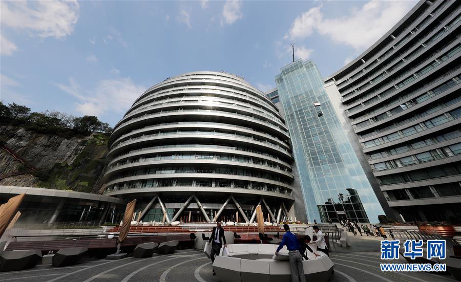 2018年10月13日,河南鄭州,龍子湖湖心島上的一棟在建大樓頂部設計為鏤空的框架結(jié)構,俯瞰酷似一顆巨大的花生。