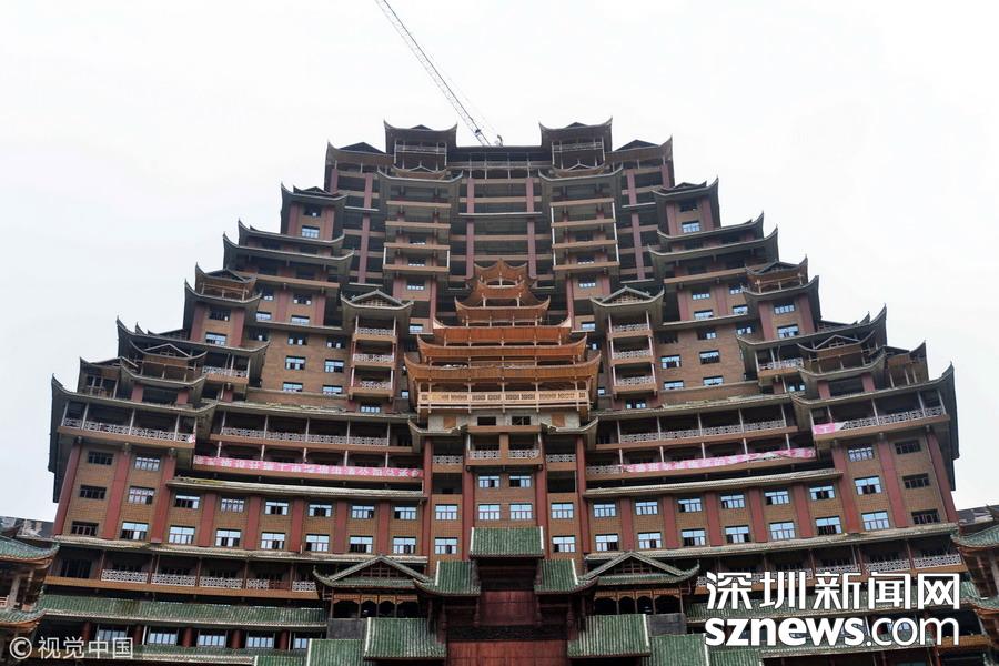 深圳新網(wǎng)網(wǎng)訊   始建于2016年9月的貴州省獨山縣水司樓已進入工程收尾階段。雄偉壯麗造型別致的水司樓,是集會展博覽、酒店住宿、游覽觀光等于一體的大型綜合體。除具有水族特色元素外,該建筑還融合了苗族、布依族特色,是獨山縣凈心谷景區(qū)最具標志性的宏大建筑。該樓占地面積5900平方米,總建筑面積60000平方米,樓高99.9米,共24層,是世界上最高大最大最壯觀的水族建筑,被稱為“天下第一水司樓”。 水司樓是按照水族依山畔水而居的傳統(tǒng)習俗和建筑特征修建,是水族人民的文化符號和智慧的象征,背靠凈心河谷山脊,以弧形的平面布局模式,如同張開懷抱的巨人,緊擁美麗的姻脂河灣,設計巧妙,工藝精巧。