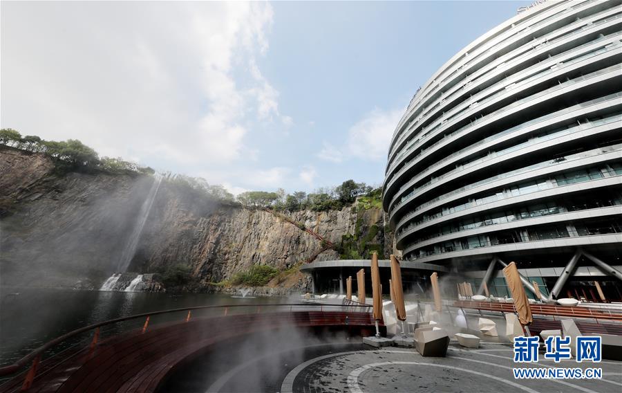 一條人造瀑布從酒店主體建筑旁的礦坑頂部流下(11月13日攝)。 位于上海松江的世茂洲際酒店11月15日正式開門營業(yè)。這家在一個廢棄采石礦坑內(nèi)建成的酒店成為上海又一新景。 新華社記者 方喆 攝