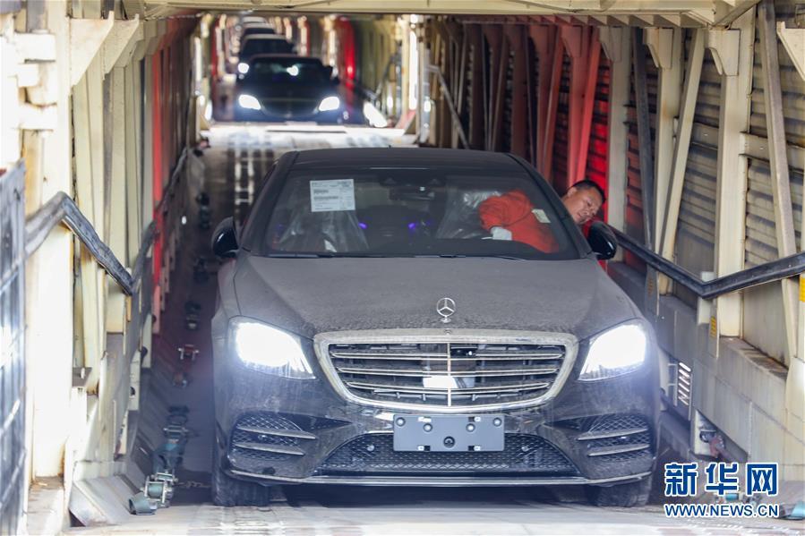 11月19日,在首趟中歐班列商品車專用車運(yùn)輸國際班列的車廂內(nèi),工作人員駕駛著進(jìn)口整車進(jìn)行卸貨作業(yè)。 新華社記者 劉潺 攝