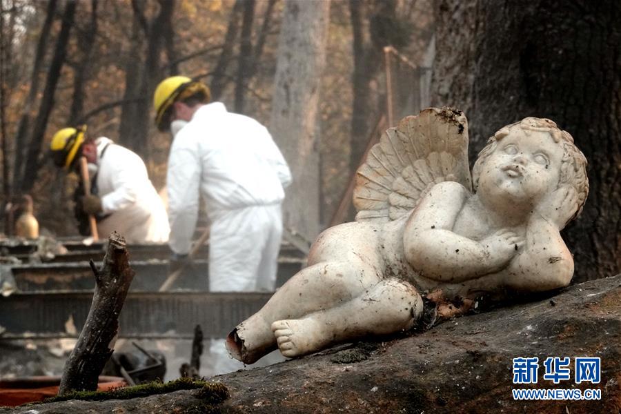 11月19日,在美國(guó)加利福尼亞州比尤特縣天堂鎮(zhèn),救援人員在山火廢墟中工作。
