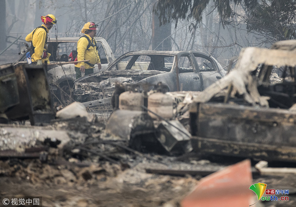 11月19日,在美國加利福尼亞州比尤特縣天堂鎮(zhèn),救援人員在山火廢墟中工作。