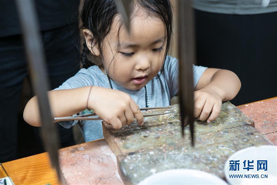 8月3日,來自西安的小朋友月白在龍?zhí)栥y飾體驗工作室中學習制作銀飾。