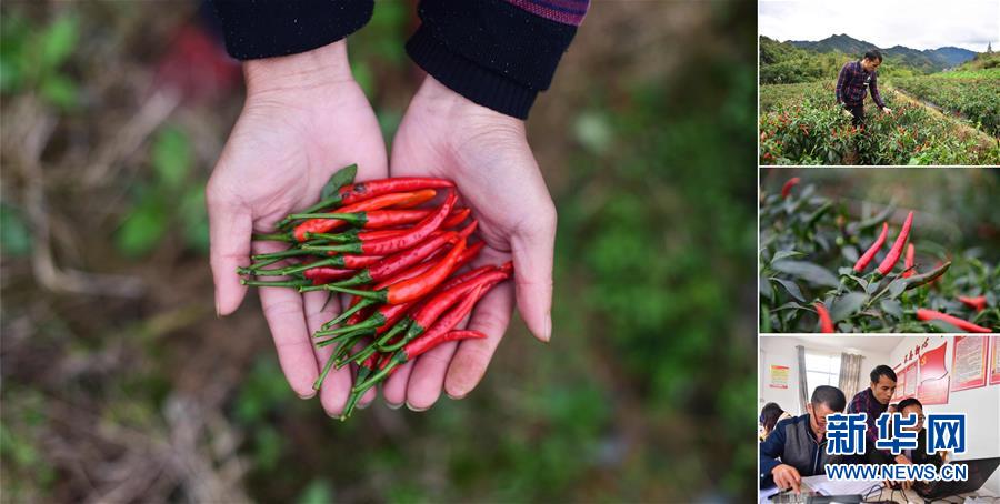 拼版照片:左圖為在大浪鎮(zhèn)大德村,龍德手捧剛剛收獲的辣椒;右上圖為龍德在摘辣椒;右中圖為合作社種植的辣椒;右下圖為龍德(中)在辦公室里工作(照片均攝于11月18日)。龍德是大德村的致富帶頭人,目前合作社種植有400多畝辣椒,帶動106戶貧困戶參與。 廣西融水苗族自治縣是國家扶貧工作重點縣,全縣“九山半水半分田”,生活生產(chǎn)環(huán)境較為惡劣,脫貧攻堅任務(wù)艱巨,目前還有7.68萬貧困人口。面對經(jīng)濟發(fā)展落后、貧困面廣且程度深的現(xiàn)狀,當?shù)匕衙撠毠耘c創(chuàng)新產(chǎn)業(yè)扶持相結(jié)合,依托生態(tài)資源優(yōu)勢,實施“特色產(chǎn)業(yè)富民行動”,通過發(fā)展特色民族旅游、林下經(jīng)濟和特色養(yǎng)殖業(yè)等扶貧產(chǎn)業(yè),帶動貧困群眾依靠勤勞的雙手,拔窮根摘窮帽,實現(xiàn)脫貧致富。據(jù)了解,目前全縣貧困戶參與特色產(chǎn)業(yè)發(fā)展的有2.9萬戶,扶貧產(chǎn)業(yè)覆蓋率達95%。 新華社記者 黃孝邦 攝
