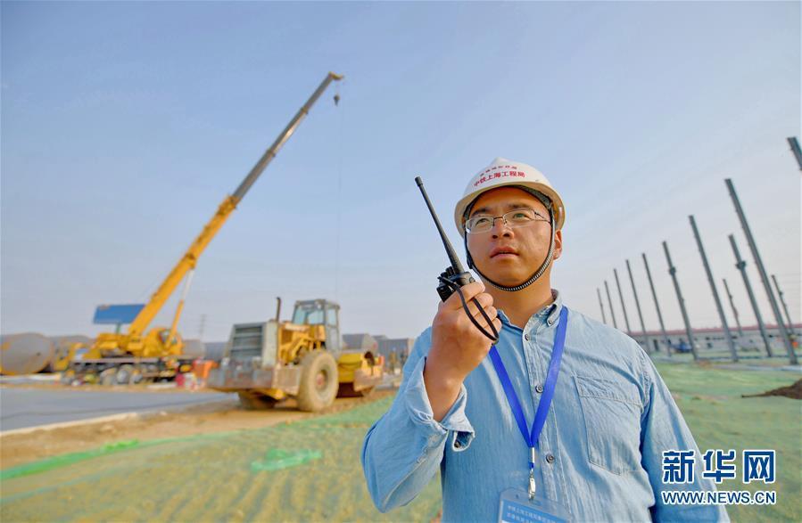4月26日,來自中鐵上海工程局京雄城際鐵路五標(biāo)二分部的工程師韓正順在京雄城際鐵路工程五標(biāo)段小型構(gòu)件預(yù)制廠場地建設(shè)現(xiàn)場用對講機(jī)指揮作業(yè)。新華社記者王曉 攝 圖片來源:新華網(wǎng)