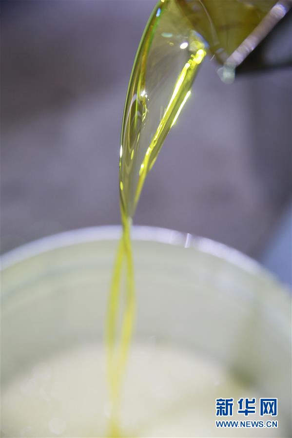 11月22日,在廣西柳州三江侗族自治縣斗江鎮(zhèn)一茶油加工點(diǎn),新榨的茶油從榨油機(jī)流出。新華社記者任正來攝