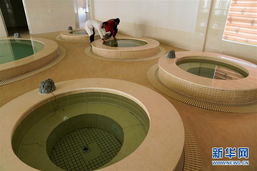 西藏自治區(qū)藏醫(yī)院風(fēng)濕病防治研究羊八井基地工作人員在查看藥浴池子(2018年11月21日攝)。新華社記者普布扎西攝