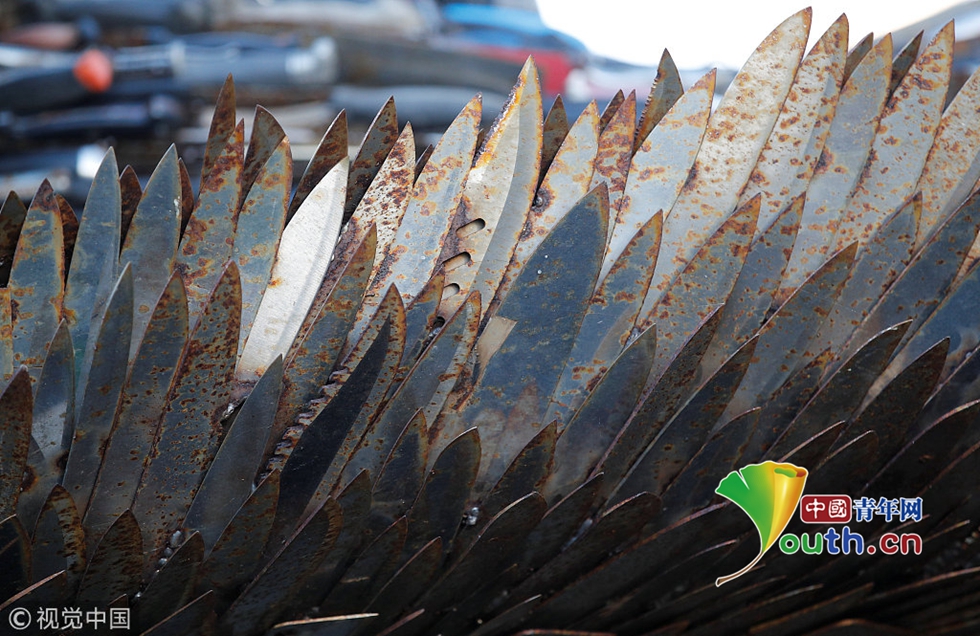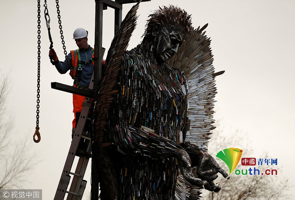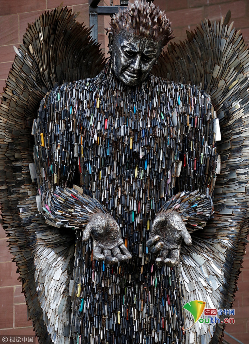 當地時間2018年11月29日,英國利物浦,藝術家阿爾菲·布拉德利在圣公會教堂外用沒收的10萬多把刀具制作了一尊名為“刀之天使”的塑像。