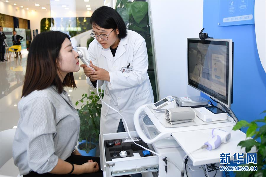 11月6日,參觀者在烏鎮(zhèn)互聯(lián)網(wǎng)醫(yī)院體驗(yàn)“智能醫(yī)務(wù)室”的體檢功能。據(jù)了解,“智能醫(yī)務(wù)室”由智能移動醫(yī)療一體機(jī)、智能藥柜以及一系列檢查設(shè)備組成,根據(jù)健康檔案和檢查結(jié)果,視頻連接家庭醫(yī)生就能解決常見的醫(yī)療健康問題。 新華社記者黃宗治攝