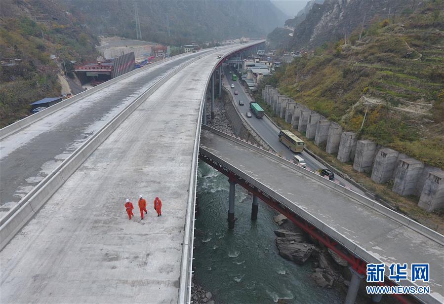 11月3日,安全管理員在克枯大橋上檢查。 當日,位于四川省阿壩藏族羌族自治州的汶(川)馬(爾康)高速的控制性工程克枯大橋合龍。 新華社記者 劉坤 攝
