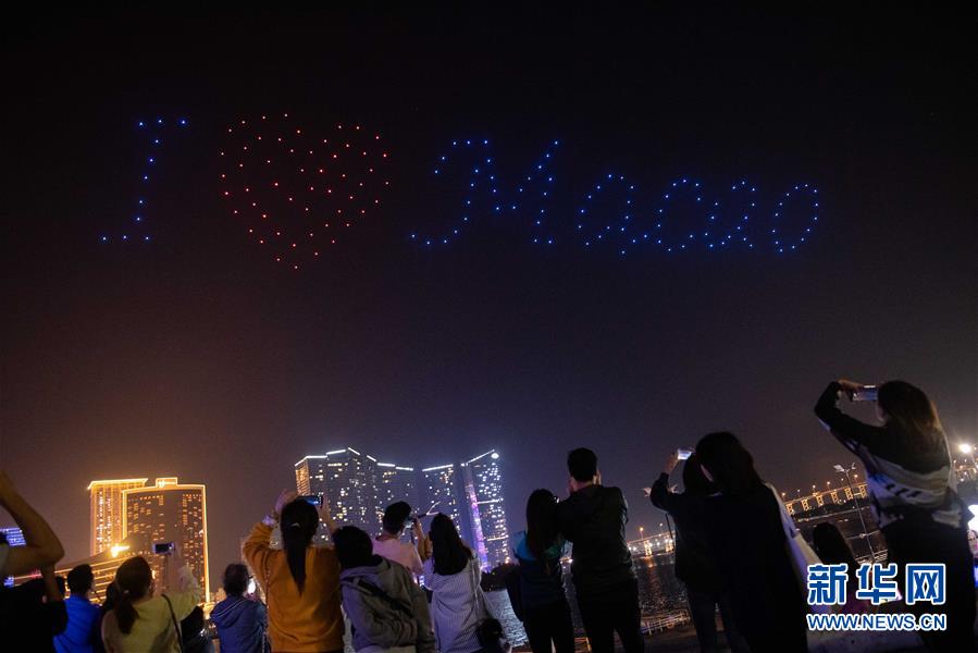 12月2日,無(wú)人機(jī)在澳門(mén)南灣湖水上活動(dòng)中心進(jìn)行空中圖案表演。 新華社記者 張金加 攝