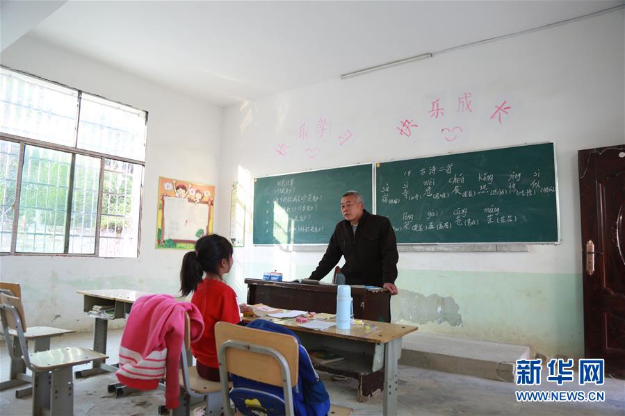 11月29日,在湖南省永州市冷水灘區(qū)黃陽(yáng)司鎮(zhèn)天里坪村小學(xué)教學(xué)點(diǎn),55歲的唐炳元在給7歲的陳宏薈上課,該教學(xué)點(diǎn)只有一名老師一名學(xué)生。 55歲的唐炳元已是滿(mǎn)頭白發(fā),他身后的墻壁上有兩塊黑板,一塊寫(xiě)著數(shù)學(xué)題,一塊寫(xiě)著漢字和拼音。空蕩的教室內(nèi),只擺有4張課桌。在今年上半年,班上還有4名學(xué)生,到下半年就只剩下1名了。