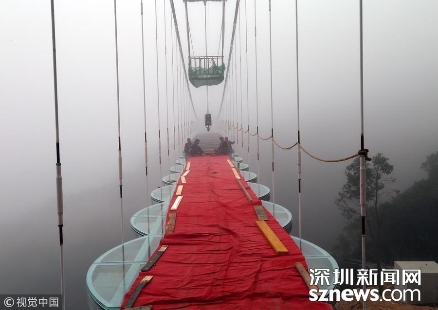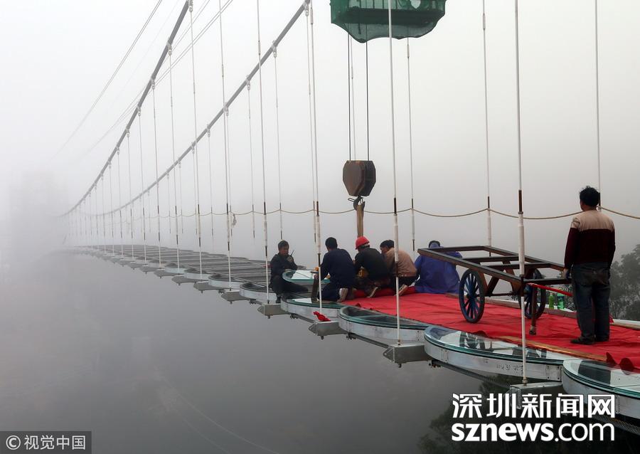深圳新聞網(wǎng)訊 2018年12月3日,在浙江玉環(huán)市上棧頭玻璃吊橋建設工地上,工人們正在北端橋頭鋪設橋面4厘米厚的玻璃,預計46個箱梁的玻璃全部鋪設完成需到5日,然后再進入安裝兩側(cè)護欄和拉攀抗風拉索,吊橋工程竣工定于23日,準備在2019年元旦試運行。
