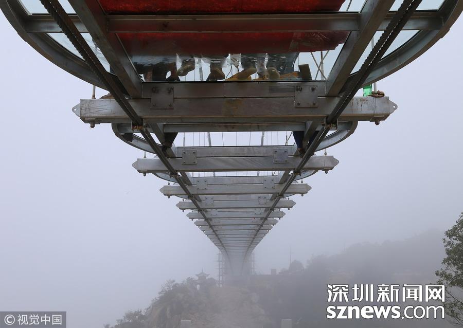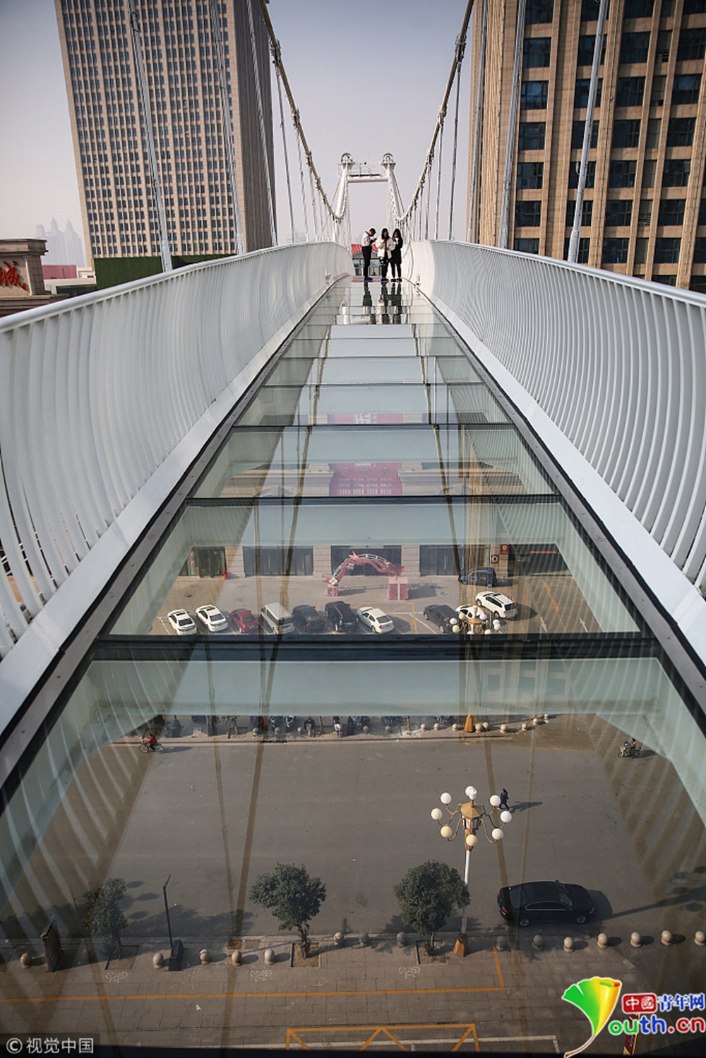 這座玻璃吊橋位于石家莊南二環(huán)附近,橋體橫跨塔通大街,長100米,高30米,。橋面由52塊特質(zhì)玻璃構(gòu)成,其中4塊為特效玻璃,游客腳踩上去就會發(fā)出玻璃破裂的聲音。